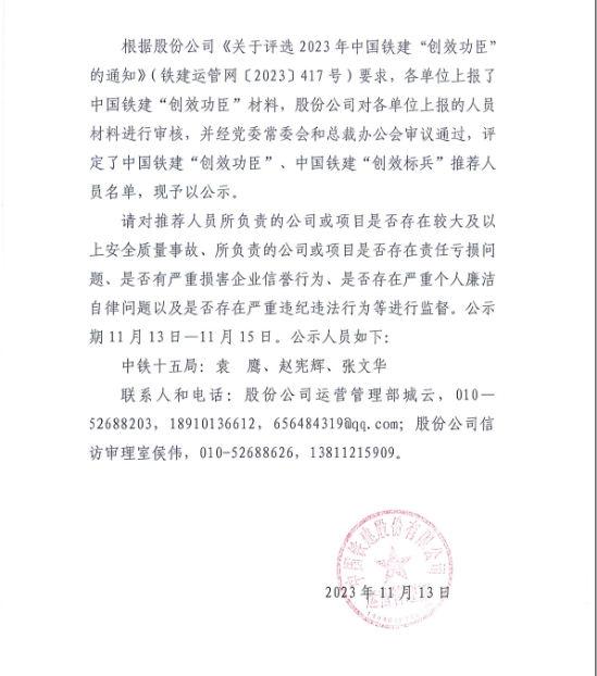 2023年中國鐵建“創(chuàng )效功臣”及“創(chuàng )效標兵”推薦人員公示