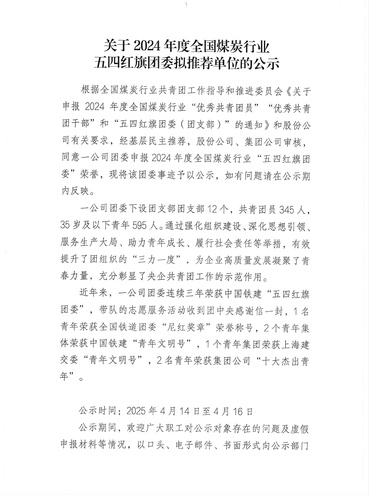 關(guān)于2024年度全國煤炭行業(yè)五四紅旗團委擬推薦單位的公示